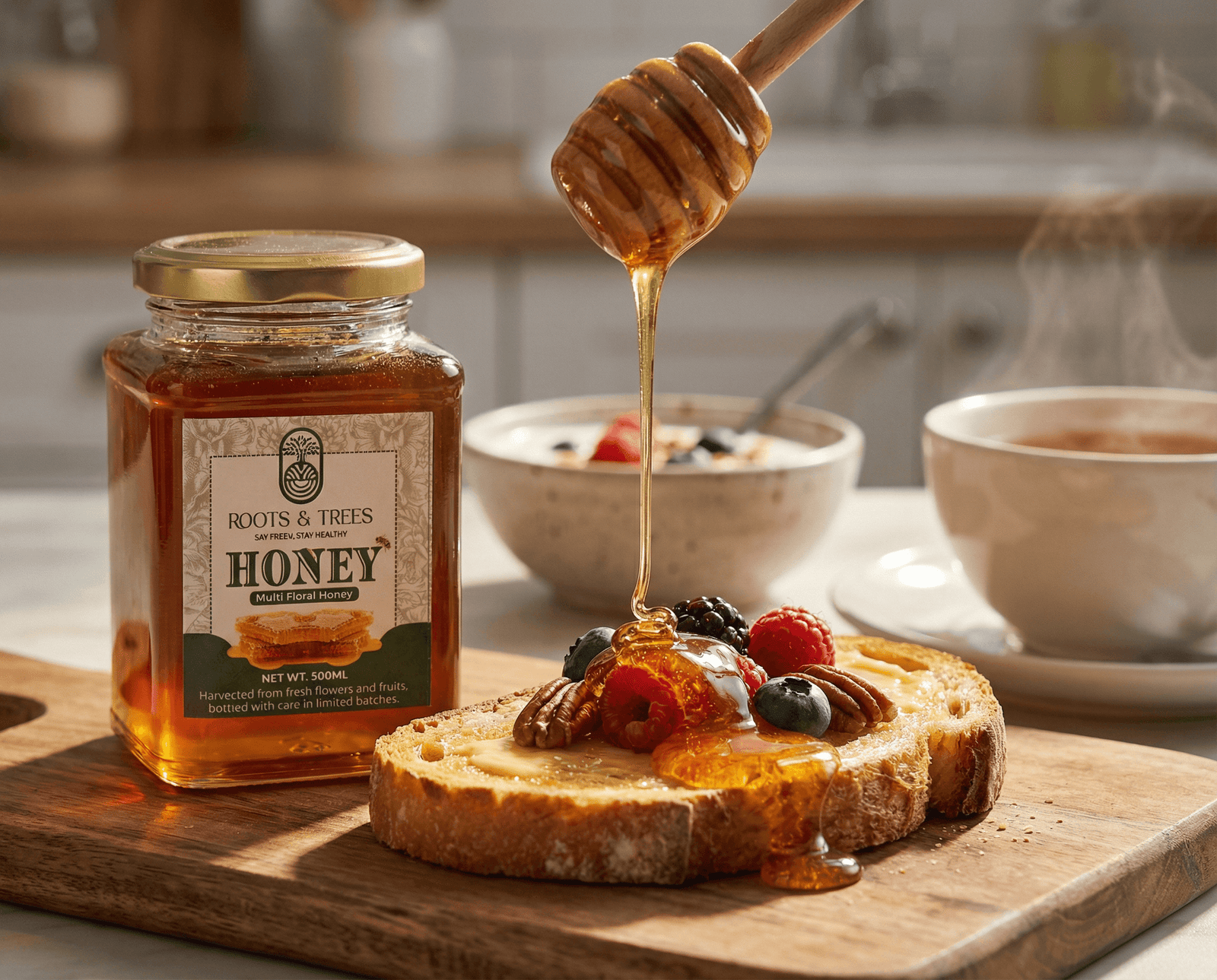 Do not refrigerate—honey may crystallize at lower temperatures (this is natural and does not affect quality).